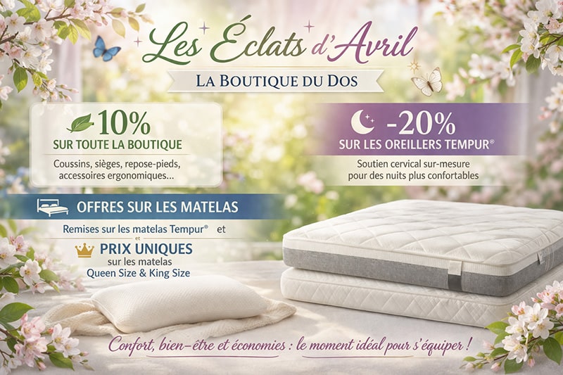 À La Boutique du Dos, nous célébrons cette période avec Les Éclats d’Avril, une opération spéciale qui met à l’honneur le confort, le sommeil et l’ergonomie, avec des remises exceptionnelles sur une large sélection de produits.